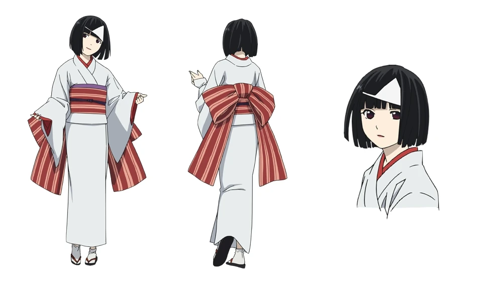 Das Gewand wird ähnlich wie ein Grabgewand getragen - reinweiß, rechts über links gekreuzt - was darauf hinweist, dass sie keine lebende Person ist. An den Füßen trägt sie Sandalen und weiße Socken mit geteilten Zehen. Ihre Augen sind kastanien-farbend und unter ihren langen Kimonoärmeln verbirgt sie die unzähligen Namen, die ihr verschiedene Götter gegeben haben.